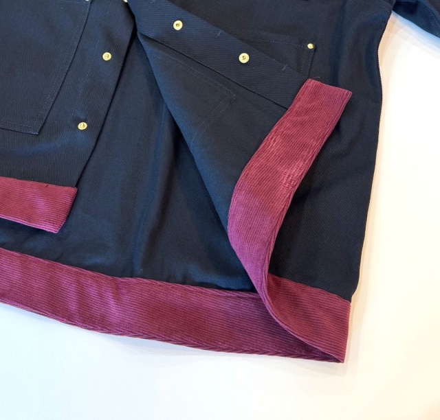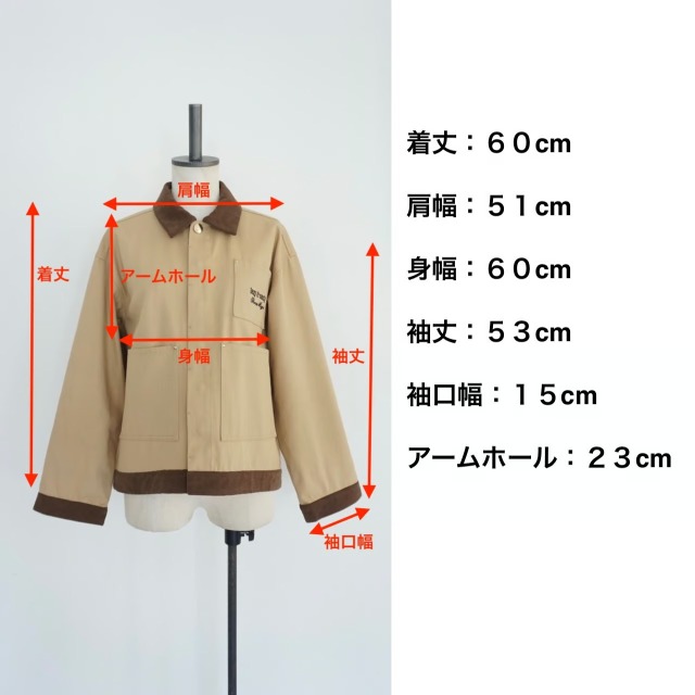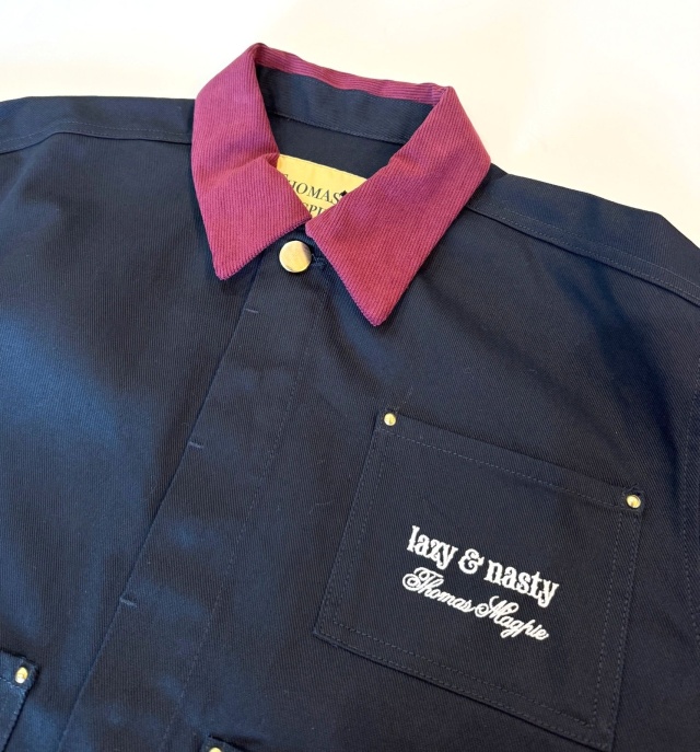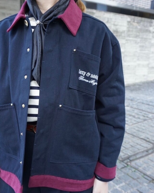 ゆったりめのサイズで着られるハンティングジャケットです。コットン100%の柔らかなツイル素材。80年代を思わせるクラシカルなコーデュロイのバイカラーの襟が印象的です。袖口も色を変えています。着丈は短めで、カーブした後ろの裾が少し都会的な雰囲気になっています。今の流行りも取り入れてみたくてデザインしました。フロントに3つのポケット。オーセンティックな雰囲気にしたくてリベットをつけています。胸元にLAZY AND NASTY 今回のテーマでもある”だらしなくてやばいやつ”のロゴを刺繍で入れました。身頃はメンズのMサイズ程度。羽織りやすくて、中に重ね着もできるゆったりとした身幅です。どなたでもサイズはあまり気にせずに着ていただけます。最初から肌触り良い膨らみのある綿を使用しており、とても柔らかな素材で、着心地も良いと思います。やや大きめのサイズですが着丈が短めなので、スカートスタイルにも向いています。ワークアイテムでありながら、都会的な雰囲気なので、デイリーのお洋服に合わせやすくて、トレンド感が楽しめるジャケットになっています。私のお勧めは、ベージュです。ネイビーはレンガ色の襟がポイントになっています。こちらはデニムなどに合わせやすくて、少し大人のスタイルが楽しめそうです。今回、1番最初にデザインしたアイテムで、1番のお勧めです。流行に敏感な方はぜひチャレンジしてみてください。届く頃のこの秋の始まりに良かった、と思える新しい切り口のアイテムです。