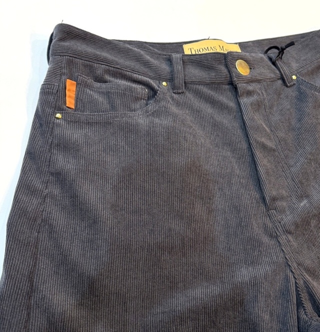 バレル(樽型)のパンツは大流行中ですが、このパンツは、大袈裟すぎない丸いシルエットのパンツで、展示会で大変好評でした。女性らしく上品な流行を押さえたシルエットだと思います。ややハイウエストです。ゴムなしのベルトでサイズは大きすぎない定番のパンツのウエストサイズになっています。細い方はベルトを着けて履いてください。着用のサンプルサイズはブラック、ブラウン、共に38サイズでパンツ丈は、やや長めになっています。トーマスマグパイのウエストゴム以外のパンツと同じサイズで、36 ~75センチ程度。38 ~78センチの方に向いています。ウエストは測ってご購入が良いかと思います。私は通常は36サイズがぴったりに作っていますが、今回は着丈は長めが好みなので38サイズも良いかもしれないな、と感じています。身長がない方も、このパンツはカットをせずに長めが良さそうです。履いてみないとあまり分からないシルエットですが、撮影の時にシルエットが綺麗だと大変好評だったのでとても嬉しく感じました。細めで肉厚ではないコーデュロイの素材とパターンが一致していて、とても良く出来たパンツです。