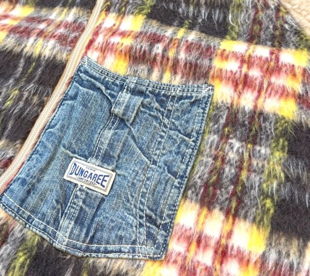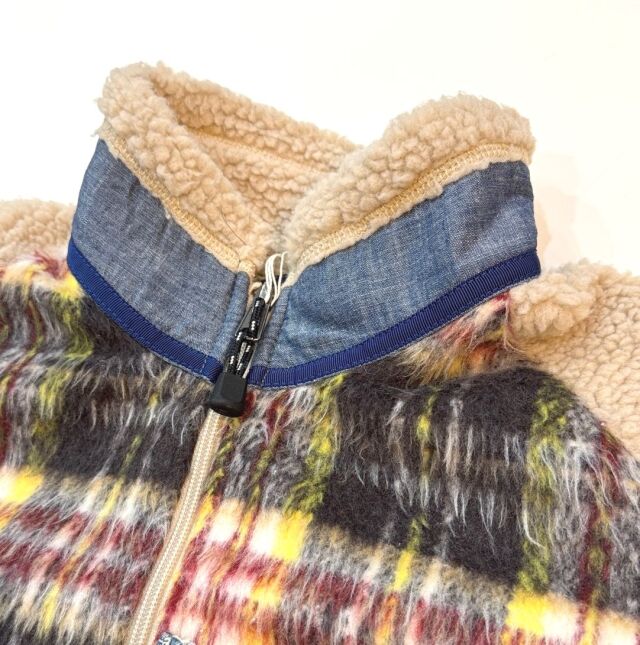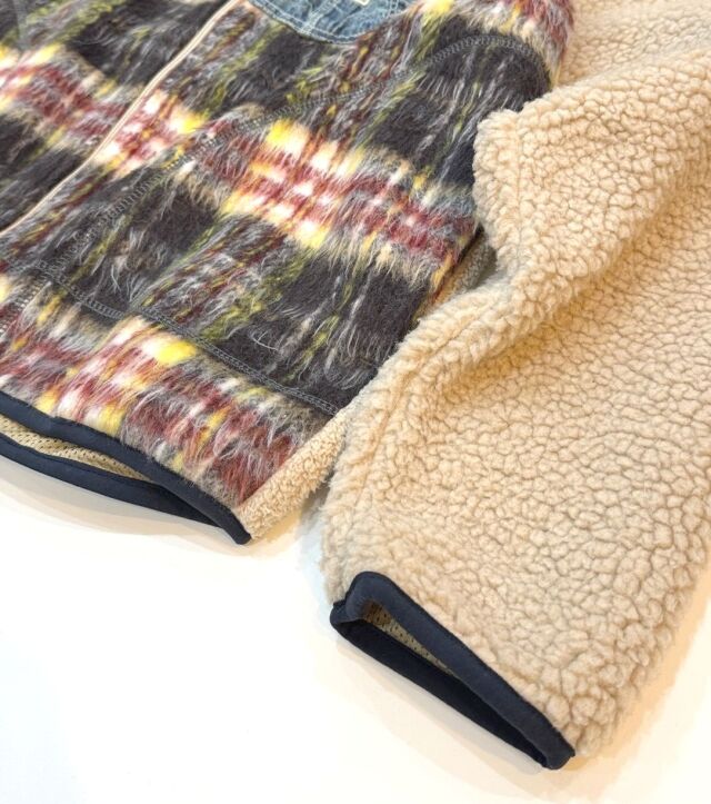 前に毛足の長いシャギーチェック、後はボアのパッチワーク 。