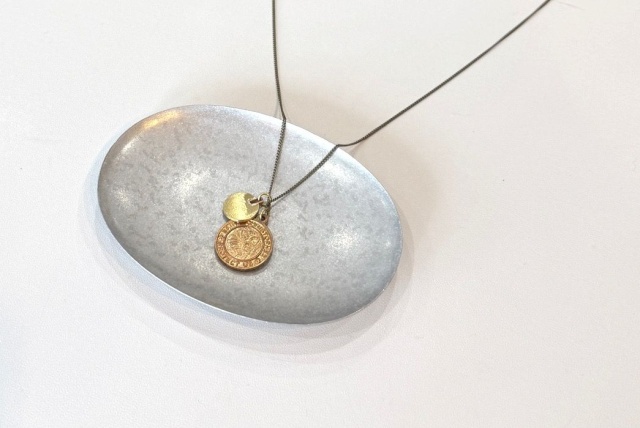 小さなコインは手作業で丸くカットした真鍮素材の円盤にジョイントを埋め込み手を加えたものです。