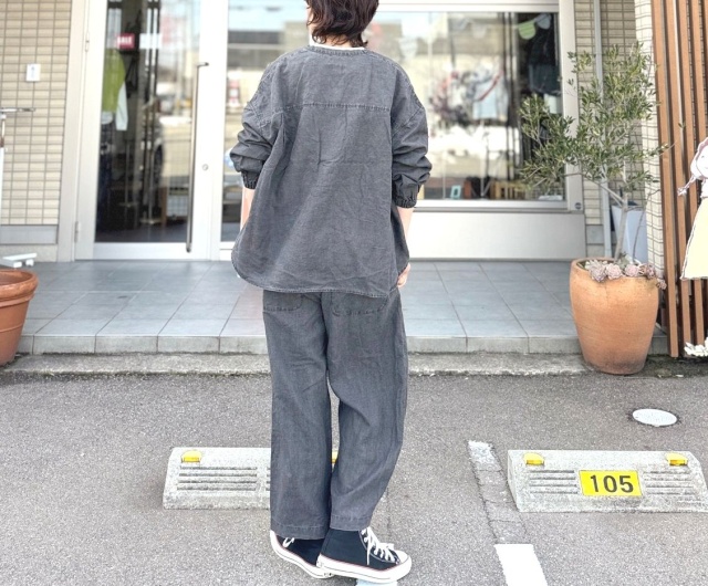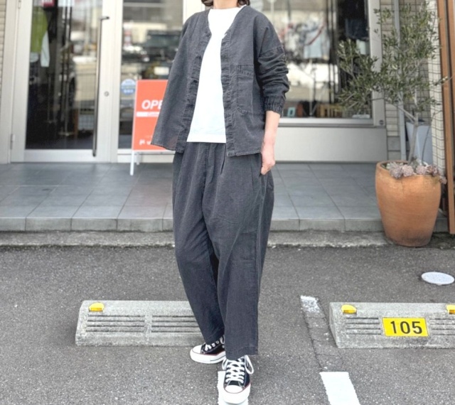 同素材のP81602 ノーカラービッグシャツと合わせてセットアップでもお楽しみいただけます。