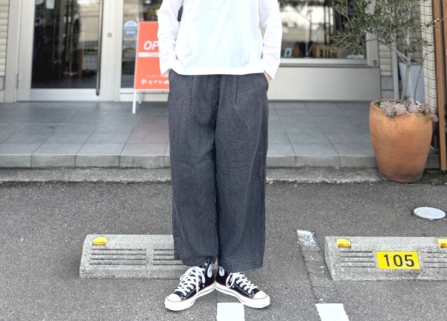 薄手ながら絶妙な生地感により、ゆったりとしたフォルムを崩さず程よく入ったタックがウエスト周りをすっきりと見せてくれます。