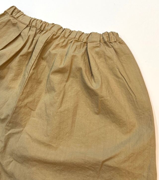 ハリのあるダンプ生地に、裾タックの丸みシルエットが映える一本。