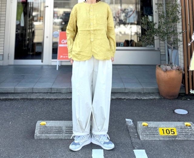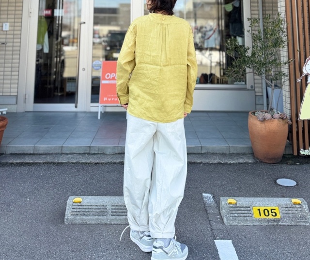 着るほどにやわらかく馴染み、麻100%ならではの経年変化も楽しめる一枚です。