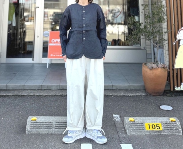 程よくゆとりを持たせたワイドシルエットに、すっきりとしたバンドカラーがバランスの良いデザイン。