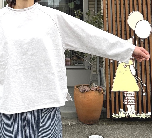 肩まわりは動きやすいラグランスリーブ仕様で、ゆったりとしたリラックスシルエット。体のラインを拾いにくく、自然な抜け感のある着こなしに仕上がります。
